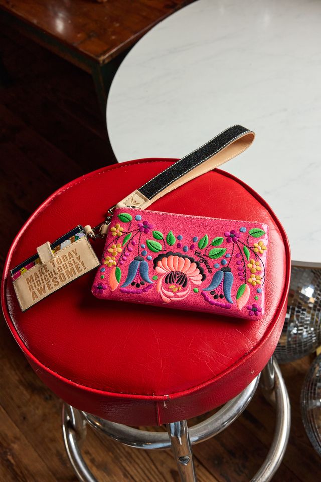 The Combi, a combination of on-the-go accessories, is a new way to carry your keys, cards, and the small stuff together or separately. This embroidered wristlet wallet includes a pocket pouch, secure card slot wallet and fits comfortably around your wrist.